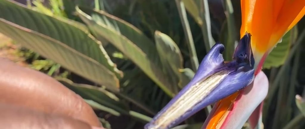 The Strelitzia flower has a specialised perch that acts as a trigger. When a bird lands on the perch, its weight causes the flower's petals to open, revealing the pollen within. As soon as the bird flies away, the petals close again, protecting the pollen from the elements.